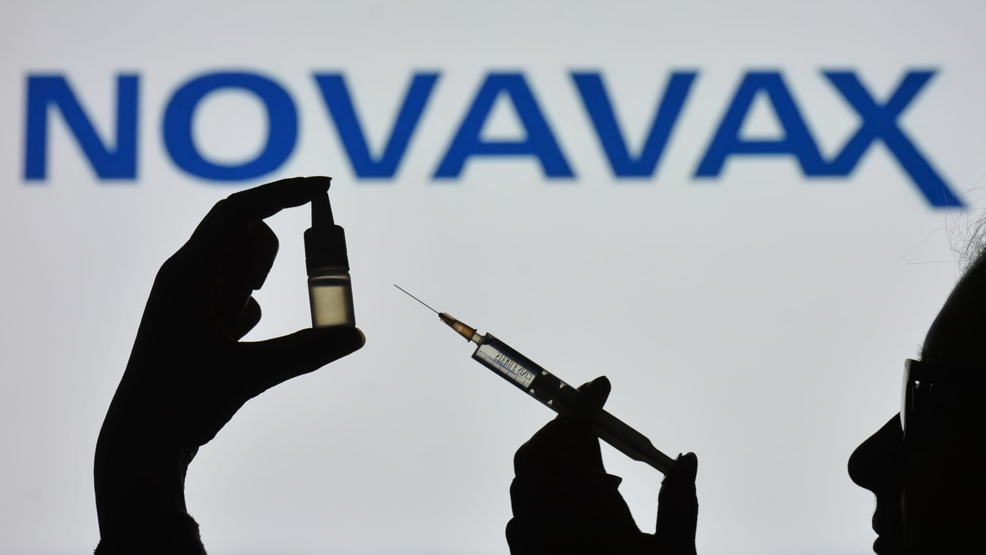 In this photograph illustration a silhouette of a person holding a medical syringe and a vial seen displayed in entrance of the Novavax brand on a display screen.